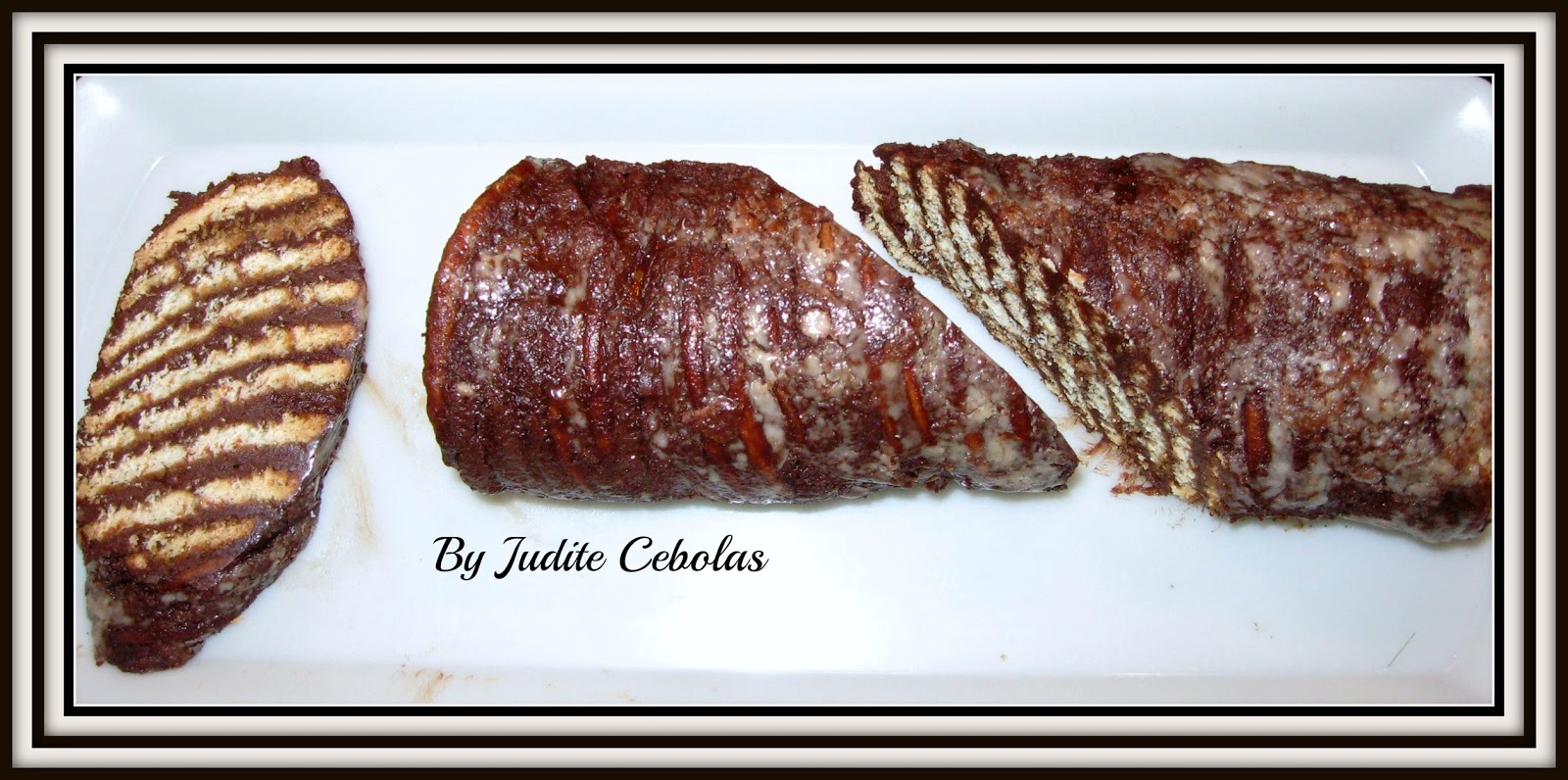 Cortar a fatia em viés para ficar às tiras de bolacha e de creme
